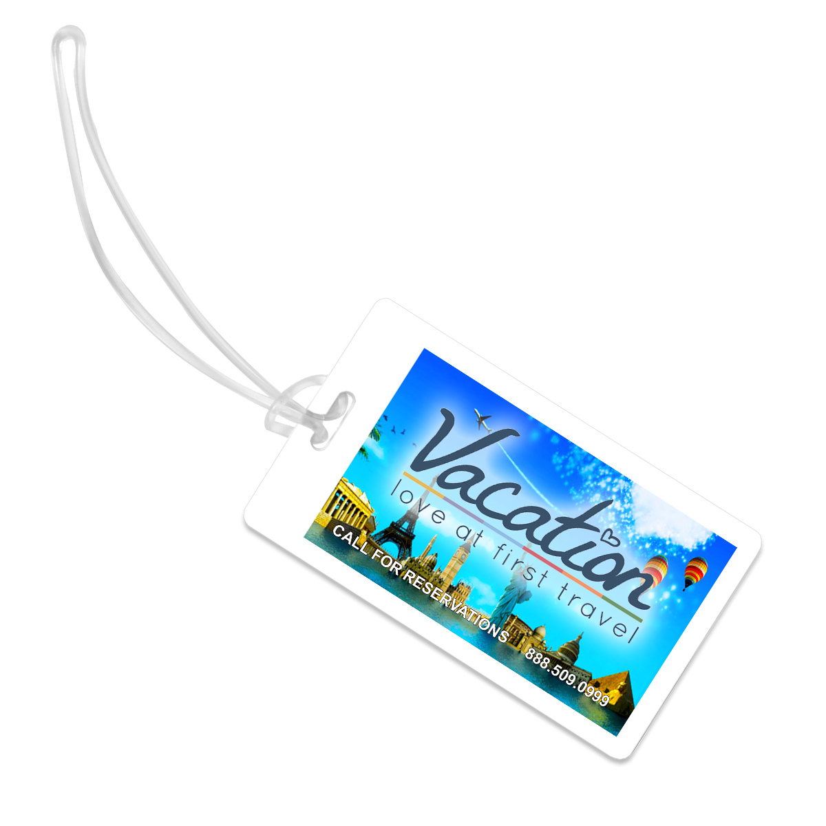 Each tag includes stock ID card inserted. (Factory cannot remove stock ID Card, no exceptions). Or just slip a business or name card into the clear pocket backing for instant luggage identification. Clear loop strap included unattached, unless otherwise specified.