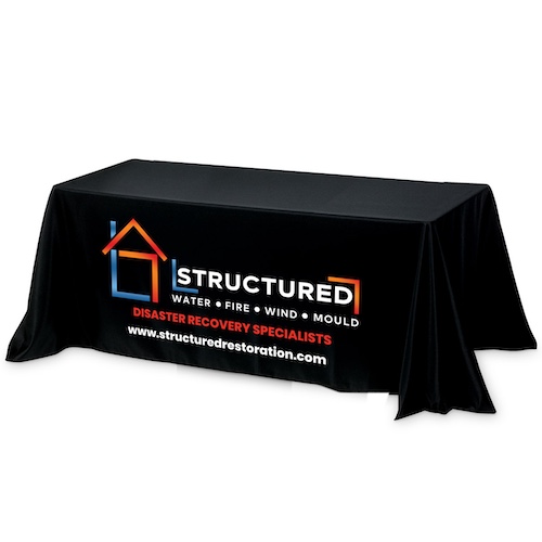 • 3 sided drops cover the front and sides of table but back is partially open.