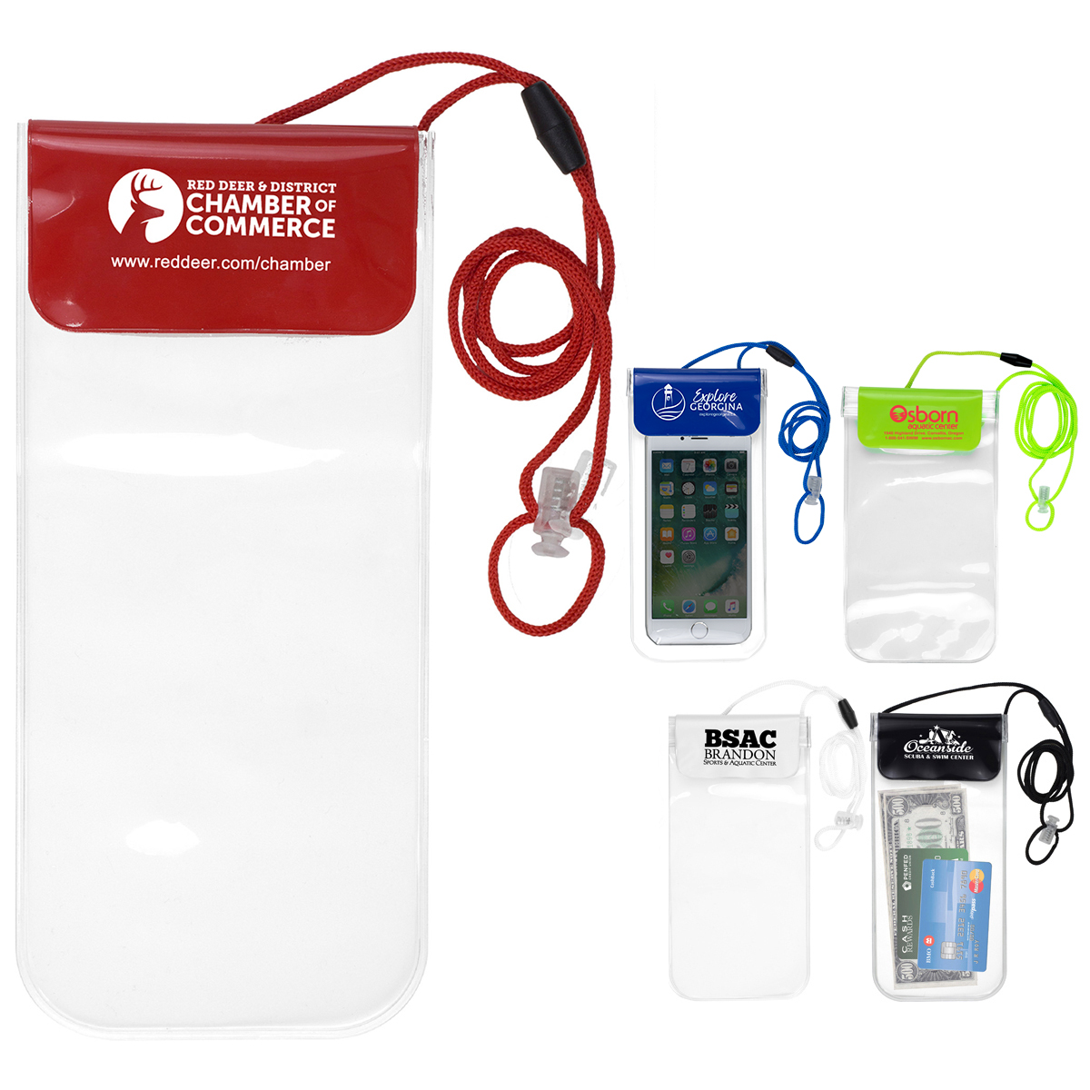 Water resistant Cell Phone carrying case. Features double fastener closure strips and a thick hook and loop fastener strip to ensure a water and dust resistant environment and a 35” adjustable and breakaway safety neck lanyard. You can also operate your cell phone through the clear vinyl window. Great for the beach, lake, river, pool, desert or other watery or dusty destinations. You can also use it to store valuables like a wallet, money, keys and credit cards. Fits the largest sized cell phones, including up to iPhone 15 Pro Max. Iphone® and Apple® are registered trademarks of the Apple® corporation.