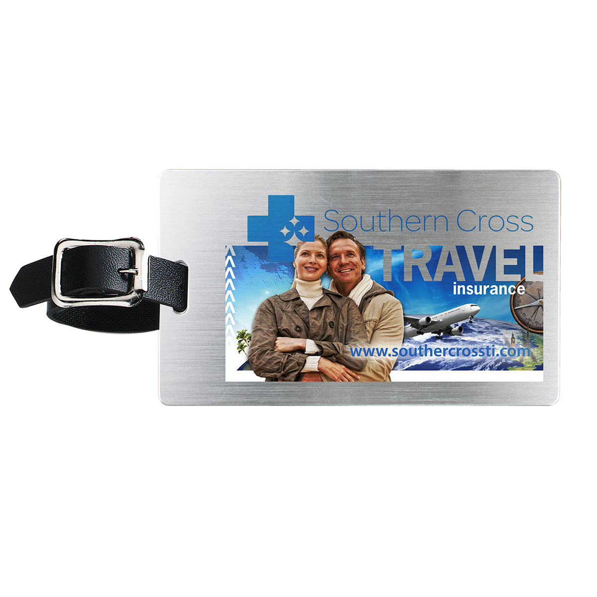 This economical brushed aluminum luggage tag is a first class bag tag with coach class pricing. It features a black leatherette luggage strap with silver accents. The back side of the tag features a clear slip in pocket to hold your business or ID card. Straps &  ID cards bulk packed