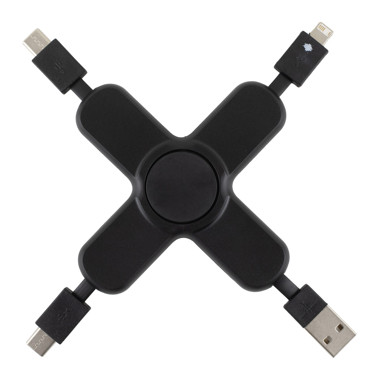 A fun and functional cable with dual input charging connectors – standard USB A and USB C -- for plugging into power sources and 3 output connectors – USB C, Apple™ and Micro USB -- for charging devices using the Apple™ and Android™ operating systems (recommended to charge one device at a time). It’s also a playful spinner stress reliever. Available with a Spot Color or Full Color Imprint. Apple™ and Android™ are registered trademarks of their respective owners.