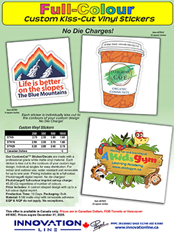 Our CustomCut™ Sticker/Decals are made with a Professional Grade White 6 Mil Matte Vinyl Material. Each Sticker is individually kiss cut to the contours of your custom logo design. There are No Die or Die Cutting Charges! They come in individual single sheets for easy distribution (as opposed to a continuous roll). For indoor and outdoor use, water resistant and removable for up to one year. (exposure to direct sunlight may accelerate fading). Pricing includes up to a full color PhotoImage® digital imprint. All Sticker designs inside the Sheet require a 1/8” white border around the artwork design.
