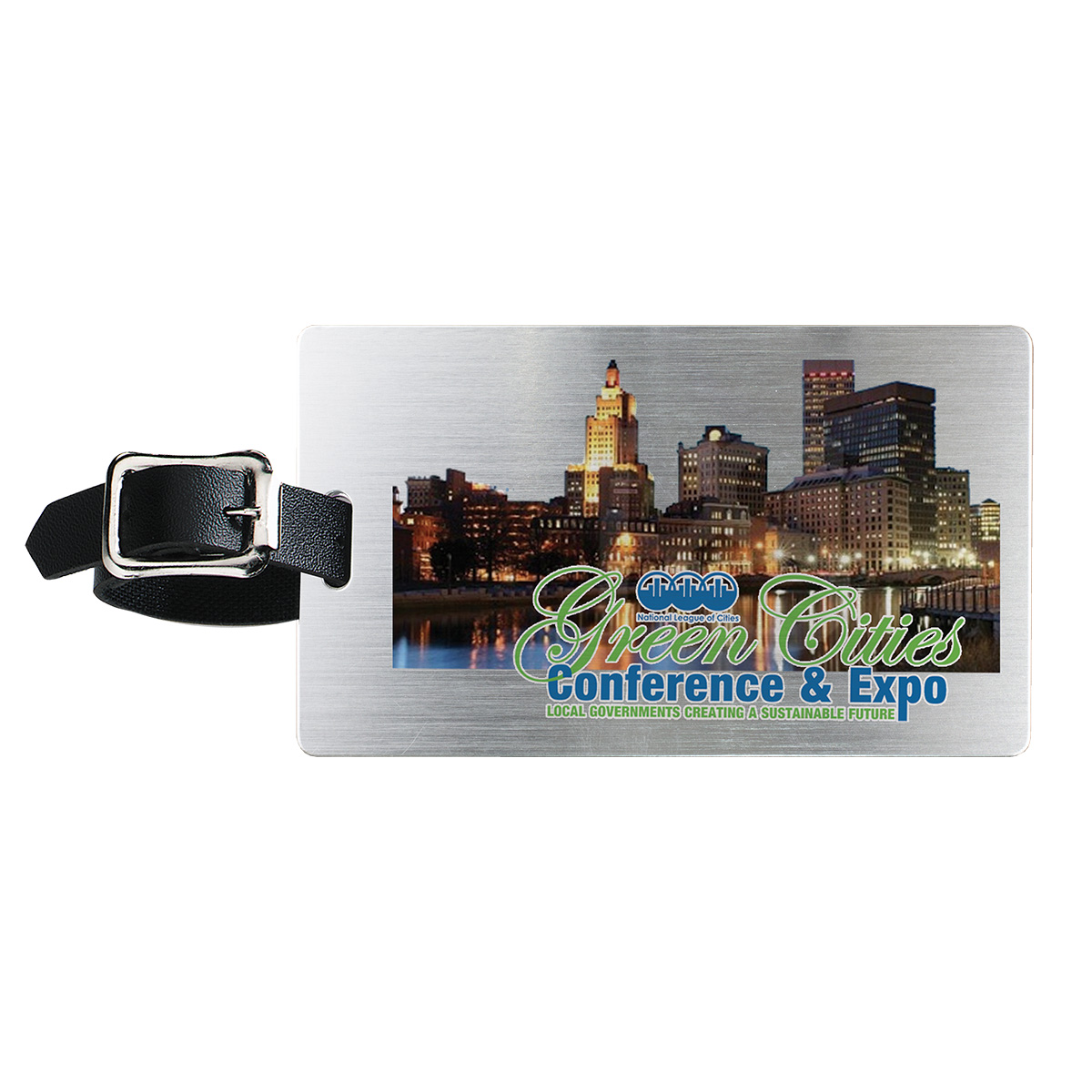 This economical brushed aluminum luggage tag is a first class bag tag with coach class pricing. It features a black leatherette luggage strap with silver accents. Available with a spot colour or Full Colour Imprint. Our patented Kwik-Seal backing seals your business or ID card against the tag with our special clear laminated adhesive. Luggage straps & ID cards included bulk separately.